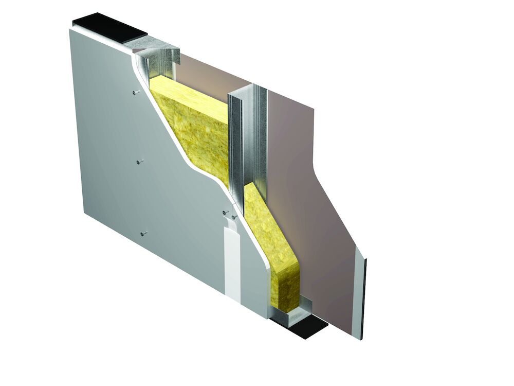 136 mm thick partition composed by 1 x 18 mm thick PregyPlac BA18 on each side, fixed to galvanized steel frame made of 40-100-40 mm horizontal U tracks and 47-99-50 mm vertical C studs. Mineral wool 80 mm thick in the cavity. According to fire classification report, glass wool with density less than 15 kg/m³ is permitted as insulation.